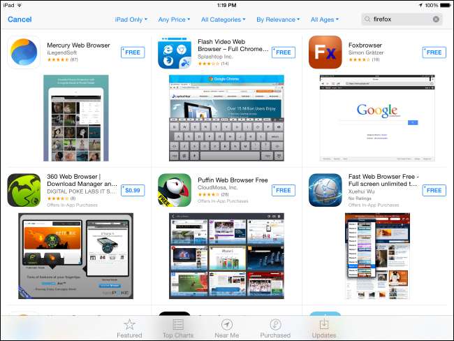 นี่คือสิ่งที่จะเกิดขึ้นเมื่อเราค้นหา Firefox บนแอพสโตร์ของ iPad Firefox ไม่พร้อมใช้งานสำหรับ iOS เราจึงเห็นการหลอกลวงที่นี่หรือไม่ ไม่ได้ แต่เราเห็นเว็บเบราว์เซอร์ของบุคคลที่สามจำนวนมากซึ่งผู้ที่กำลังมองหา Firefox อาจสนใจ "Foxbrowser" อาจดูเหมือนเลียนแบบ Firefox แต่เป็นเบราว์เซอร์ที่มี Firefox Sync ในตัว ไม่ได้ออกแบบมาเพื่อหลอกลวงผู้ใช้ แต่มีคุณลักษณะที่เป็นประโยชน์สำหรับผู้ใช้ Firefox