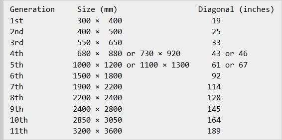 ดังนั้นแก้วรุ่นที่ 10 จะสร้างทีวี 150″ หนึ่งเครื่อง (ซึ่งใช้เฉพาะในงานแสดงสินค้าเพื่อแสดงขนาดของแก้วแม่ที่โรงงานหนึ่ง ๆ สามารถรองรับได้) หรือจะทำทีวี 50″ เก้าเครื่อง กระจกรุ่นที่สองสามารถสร้างจอแสดงผลเดสก์ท็อปขนาด 24 นิ้วที่สวยงามหรือจอแสดงผล 11.6″ สี่จอได้
