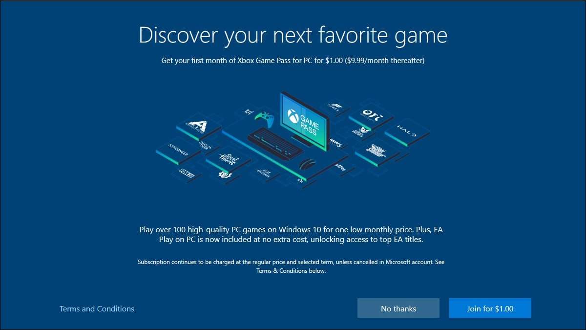 ในขณะที่ตั้งค่าพีซีเครื่องใหม่คุณอาจเห็นหน้า "ค้นหาเกมที่คุณโปรดปรานของคุณ" ที่แจ้งให้คุณคลิก "เข้าร่วม $ 1.00" หรือพูดว่า "ไม่ขอบคุณ" กับข้อเสนอที่น่าทึ่งนี้