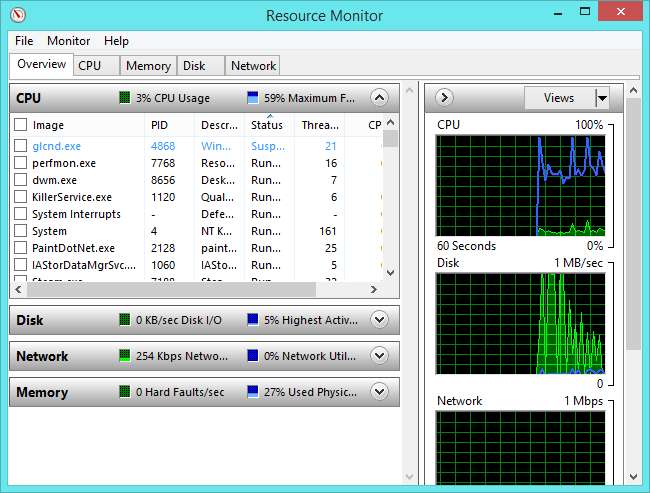 Kaynak İzleme aracı donanım kaynak kullanımınız hakkındaki bilgileri görüntüler - CPU, disk, ağ ve bellek. Araç aynı zamanda uygulamaya göre kullanımı da böler, böylece hangi uygulamaların disk sürücünüze yazdığını veya hangi çalışan işlemlerin en çok ağ bant genişliğini kullandığını görebilirsiniz.