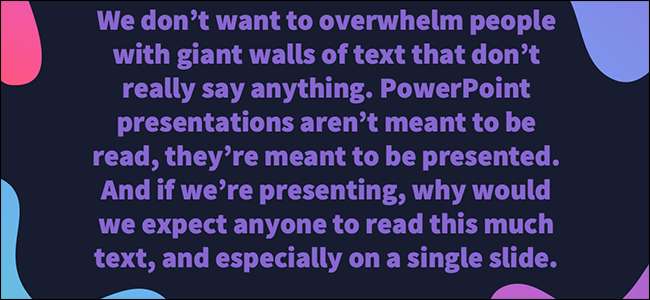 Bu, görüntülerin yanı sıra metin için de geçerli. Aslında, aslında, sunucunun onları göründükleri gibi okuduğu bir dizi slayttan daha fazla bir şey yoktur. Seyirciniz okuma yeteneğine sahiptir ve sürgü ile yapılırlar ve bitmeden çok önce Reddit'i tarayacaklar. Enteralli metni ekrana koymaktan kaçının ve izleyiciniz size teşekkür eder.