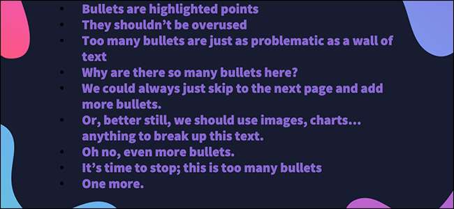 Bunun yerine, büyük listeleri üç veya dört kurşun noktasına nasıl ayırabileceğinizi düşünün. Daha fazla mermi puanı kullanmanız gerekip gerekmediğini veya birden fazla konuyu yerine tek bir noktaya birleştirebilirseniz dikkatlice düşünün. Ve eğer yapamazsanız, bir sunumda sahip olabileceğiniz slayt sayısını sınırlayan kimse olmadığını unutmayın. Her biri, her biri dört noktadan üç sayfaya 12 puanın bir listesini kırmak her zaman mümkündür.