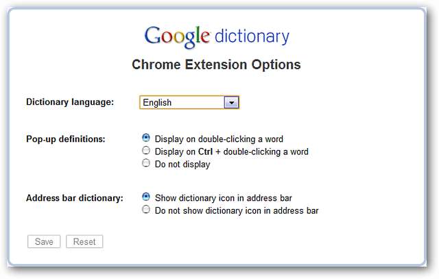 Bunlar Google Sözlüğü için seçeneklerdir. İstenen sözlük dilini, açılır tanımların nasıl etkinleştirildiğini (veya etkinleştirilmediğini) ve “Adres Çubuğu Simgesi” ni kullanmak isteyip istemediğinizi seçin.