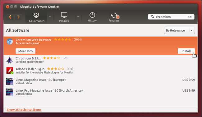 Ubuntu Yazılım Merkezi'ni açın, arama kutusuna Pidgin yazın, Pidgin Internet Messenger'a tıklayın, Yükle'ye tıklayın ve parolanızı girin. Arama kutusuna Chromium yazın, Chromium Web Tarayıcısı'nı ve ardından Yükle'yi tıklayın.