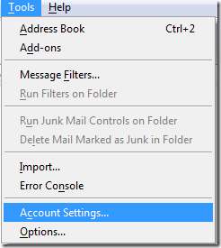 Bu metin dosyasını sabit sürücüde tanıdık bir konuma kaydedin. Benimkini Belgelere koydum. Ardından Thunderbird'ü açın ve Araçlar Hesap Ayarları'na tıklayın.