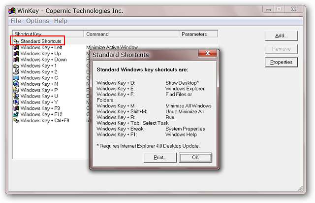 Yönettiği normal yerleşik Windows klavye kısayollarını görmek için "Standart Kısayollar" ı tıklayarak seçin ve ardından "Özellikler" e tıklayın.