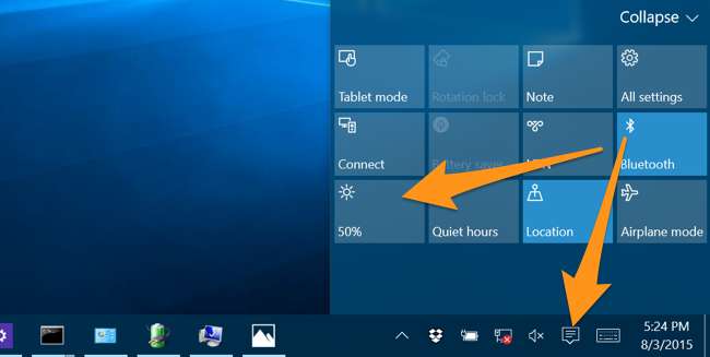 Windows 10'daysanız, biraz farklı görünecek, ancak üzerinde parlaklık kontrolü olması gereken paneli kaydırmak için tepsideki Bildirimler simgesine tıklayabilirsiniz.