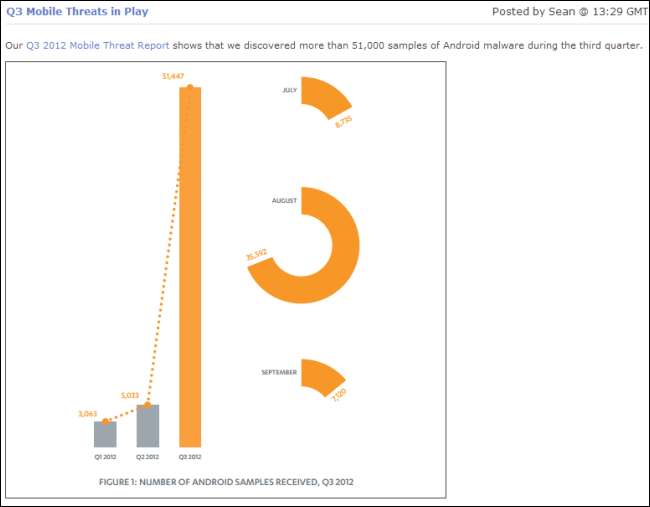 Bir diğeri F-Secure tarafından yapılan son çalışma Android kötü amaçlı yazılımının patladığını bulan, 2012 yılının 3. çeyreğinde kulağa korkunç gelen 28.398 Android kötü amaçlı yazılım örneği buldu. Ancak bu örneklerden yalnızca 146 tanesi Google Play'den geldi - başka bir deyişle, bulunan kötü amaçlı yazılımların yalnızca% 0,5'i Google Play'den geldi. % 99,5'i Google Play dışından, özellikle kötü amaçlı yazılım için kontrol veya denetim yapılmayan diğer ülkelerdeki resmi olmayan uygulama mağazalarından geldi.