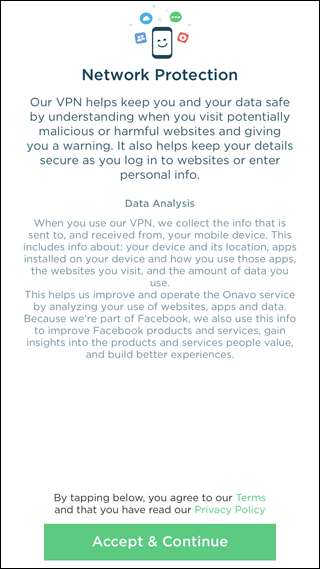 Bakın, Facebook web'de yaptığınız birçok şeyi izleyebilir, ancak telefonunuzdaki diğer uygulamalarda yaptıklarınızı izleyemez. Ancak Onavo Protect'i açtığınızda, yönlendirme yaparsınız herşey Facebook sunucuları üzerinden internet trafiğinizin, görmeleri için şifresinin çözüldüğü yer. Wall Street Journal bununla ilgili bir makale yayınladı Geçen yıl, ancak bunu öğrenmek için o kadar kazmanıza bile gerek yok — Onavo Protect, uygulamayı ilk açtığınızda size bundan bahsediyor: