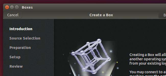 GNOME Kutuları, bilgisayarlarınızda veya uzak bir sunucuda sanal makinelerinizde çalışan yerel sanal makineler oluşturabileceğini açıklayan bir giriş gösterecektir.