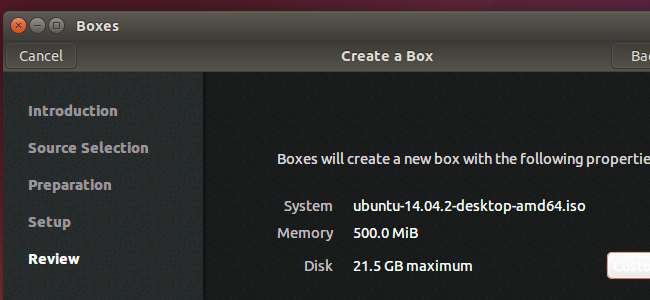 Diğer sanallaştırma araçları gibi, Boxes da sağladığınız ISO dosyasındaki işletim sistemini otomatik olarak algılar ve önerilen varsayılan ayarları sağlar. Varsayılan ayarları otomatik olarak kabul ederek ve sisteminiz için iyi yapılandırılmış bir sanal makine edinerek, sadece "Devam" ı tıklayıp sihirbazdan geçebilmelisiniz.