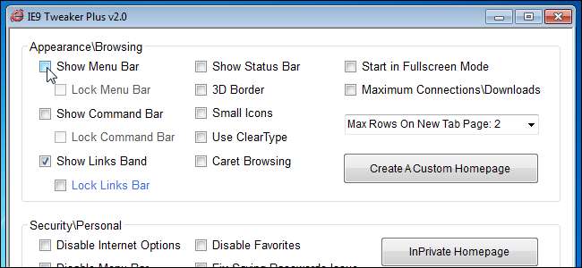 IE9 Tweaker Plus v2.0 iletişim kutusu görüntülenir. Üst bölüm, tarayıcının görünümünü ve göz atma işlevlerini etkileyen ayarları değiştirmenize ve ayrıca bu makalenin ilerleyen bölümlerinde ele alacağımız özel bir ana sayfa oluşturma olanağı sağlamanıza olanak tanır.