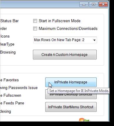 Alt bölümü kullanarak güvenlik ve kişisel ayarları da değiştirebilirsiniz. InPrivate modunu IE'de sık kullanıyorsanız, bir masaüstü kısayolu ve InPrivate modunda IE'yi otomatik olarak açan bir Başlat menüsü kısayolu ayarlayabilirsiniz. InPrivate modunda ana sayfanız olarak açılacak sayfanın URL'sini ayarlamak için, Güvenlik / Kişisel bölümündeki InPrivate Ana Sayfası düğmesine tıklayın.