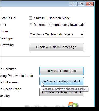 InPrivate modunda IE'yi açmak üzere masaüstüne bir kısayol koymak için InPrivate Masaüstü Kısayolu'na tıklayın. Ayrıca InPrivate StartMenu Kısayolu'na tıklayarak InPrivate modu için bir kısayol da Başlat menüsüne ekleyebilirsiniz.