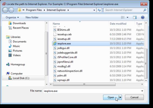 Görüntülenen iletişim kutusundan Internet Explorer yolunu seçin. Varsayılan yol zaten seçilmiş olmalıdır. Yanlışsa, doğru yolu seçin. Ardından, iexplore.exe dosyasını seçin ve Aç'a tıklayın.