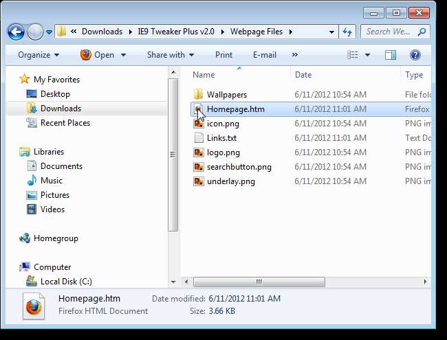 Homepage.htm dosyası, IE9 Tweaker Plus yürütülebilir dosyasını içeren klasördeki Web Sayfası Dosyaları klasöründe oluşturulur.