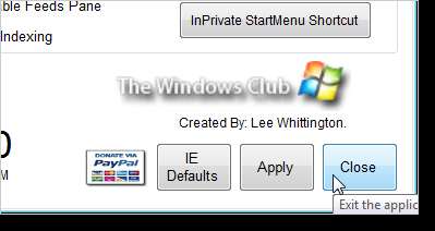 IE Tweaker Plus'ta seçilen ayarları uygulamak için Uygula'ya tıklayın. Bitirdiğinizde Kapat'ı tıklayın.