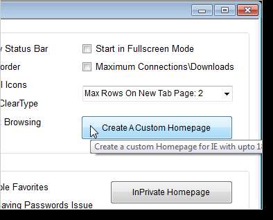 IE Tweaker Plus ayrıca IE için (ve diğer tarayıcılar için) özel bir ana sayfa oluşturmanıza izin verir. Web sitelerine en fazla 18 bağlantı ve ana sayfanıza bir arama kutusu ekleyebilirsiniz. Görünüm / Göz Atma bölümünde Özel Ana Sayfa Oluştur'u tıklayın.
