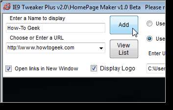 HomePage Maker açılır. Ana sayfanıza bir web sitesi eklemek için, Görüntülenecek bir Ad Girin düzenleme kutusuna ana sayfa için bir ad girin ve URL Seç veya Gir düzenleme kutusuna sayfanın URL'sini girin. Siteyi ana sayfanıza eklemek için Ekle'yi tıklayın. Eklemek istediğiniz tüm siteler için bunu tekrarlayın.