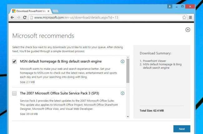 Bu düğmeyi tıkladığınızda, MSN / Bing ayar değiştiricisinin varsayılan olarak kontrol edildiği Microsoft Önerileri ekranına yönlendirilirsiniz. Sorun şu ki, eğer dikkat etmiyorsanız ve yalnızca Microsoft'a güveniyorsanız, sol tarafta bir onay kutusu olan ilk şeyin aslında indirmek istediğiniz şey olduğunu varsayabilir ve İleri'yi tıklayabilirsiniz.