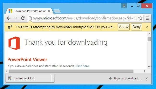 İleri düğmesini tıkladığınızda, bir sonraki sorunun ortaya çıktığı indirme ile karşılaşırsınız. Google Chrome kullanıyorsanız, sitelerin birden fazla dosya indirmesini otomatik olarak engeller. Ve normal bir kullanıcı olarak indirmeyi düşündüğünüz PowerPoint Görüntüleyici olmasını bekleyeceğiniz ilk dosya… değil. İndirilen ilk şey, Bing tarayıcı yeniden yönlendiricisidir. Gerçekte istediğiniz şeyi elde etmek için İzin Ver'i tıklamanız gerekir.