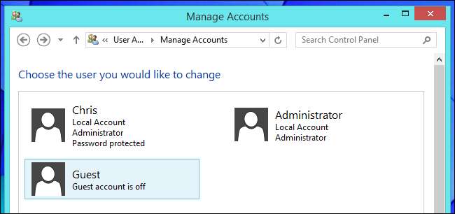 Windows 8.1, bir ziyaretçi hesabı , yine de varsayılan olarak devre dışıdır. Masaüstü Kontrol Panelinden etkinleştirmeniz gerekecek. Bunu yaptıktan sonra, oturum açma ekranında Misafir hesabını seçerek bilgisayarınızda parola olmadan herkes oturum açabilir. Konuk hesabını kullanan herkes bilgisayarınıza sınırlı erişime sahip olacaktır, bu nedenle misafirlerin bir web tarayıcısına erişmesine izin verirken yapabilecekleri hasarı ve gözetlemeyi kısıtlamak için idealdir.
