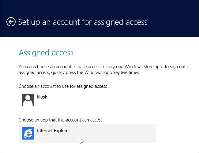Windows 8.1, atanmış erişim için hesaplar ayarlamanıza izin verir. Atanan erişim hesabının yalnızca tek bir uygulamaya erişimi vardır - evet, bu, masaüstü uygulamalarına değil, yalnızca Mağaza uygulamalarına izin verildiği anlamına gelir. Örneğin, bir hesap oluşturabilir ve bunu yalnızca Internet Explorer ile sınırlandırabilirsiniz. yalnızca web tarayıcısı, kiosk benzeri bir hesap oluşturmak . Daha garip bir şekilde, atanmış erişimi kullanabilirsiniz Windows 8.1 sisteminizdeki bir hesabı Chrome-OS tarzı bir ortama dönüştürün .