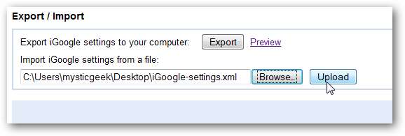 Şimdi farklı hesabınızda oturum açtığınızda Ayarlar sayfasının altına gidin. Bu kez kaydedilmiş iGoogle XML belgenizin konumuna göz atın ve ardından İçe Aktar'ı tıklayın.