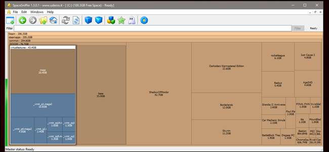 Bu geleneksel bir "oyun" uygulaması değil, ancak modern dijital dağıtım sistemleri oyun geliştiricilerini kaynaklarını optimize etme konusunda tembelleştirdiği için yine de oldukça kullanışlıdır. Yeni AAA oyunları genellikle 50 gigabayt veya daha fazla yer kaplarken ve SSD'ler boyut / dolar oranı açısından hala oldukça sınırlı olduğundan, genellikle kendinize boş yer bulamayabilirsiniz. SpaceSniffer depolama sürücünüzün içeriğini daha büyük kareler daha fazla yer kaplayan dizinleri belirten görsel bir ızgarada gösterir. En büyük oyunlar için Steam veya Origin oyun klasörlerinize hızlı ve kolay bir şekilde bakmanızı sağlar. Dosyaları doğrudan SpaceSniffer arayüzünden silmek mümkündür, ancak bu muhtemelen oyunlar için manuel kurulum kaldırmaya bırakılması daha iyidir.