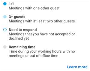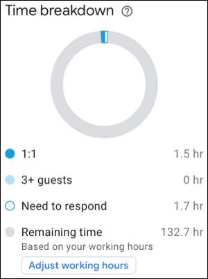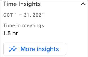 Bu, şu anda kullandığınız takvim görüntüsüne bağlı olarak, gün, hafta, ay veya yıl için toplantılarda zamanınıza hızlı bir görünüm kazandırır. Ayrıntılı bir görünüm elde etmek için, sağdaki kaydırılabilir bir kenar çubuğunu açan "Daha Fazla Insights" yı tıklayın.