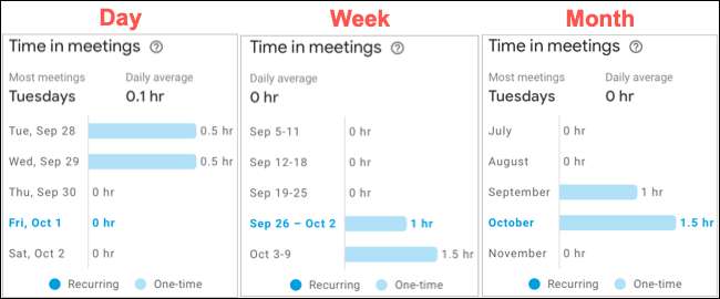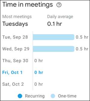 Üstte, toplantılarınızın çoğu günün hangi gününün günlük ortalamalarınızla birlikte olduğunu görebilirsiniz. Aşağıda, bir kerelik toplantıların açık mavi renkte göründüğünü göreceksiniz. Tekrarlayan toplantılar daha koyu mavi.