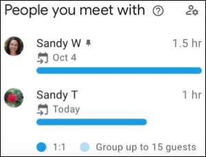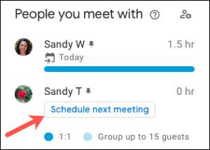 Sıkıştırılmış insanlarla toplantılarda geçirdiğiniz zaman miktarını görmekle birlikte hızlıca yapabilirsiniz. Biriyle buluşma planlayın Listenizde. "Sonraki Toplantı Zamanlaması" nı tıklayın ve bir etkinlik detayı sayfası, işbirliğinizle konuk olarak açılacaktır. Bilgileri tamamlayın ve Google Takvim olayını normalde yaptığınız gibi kaydedin.