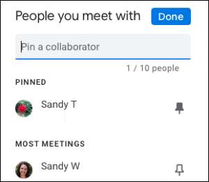 Bu bölümden çok hoş olan şey, 10 kişiye en fazla 10 kişiyi manuel olarak pin yapabilmenizdir. Bu nedenle, belirli biriyle toplantılara sık sık katılırsanız, dişli simgesini tıklatın ve listeden seçin. "Yapıldı" i tıklayın ve listenize sabitlenirler.
