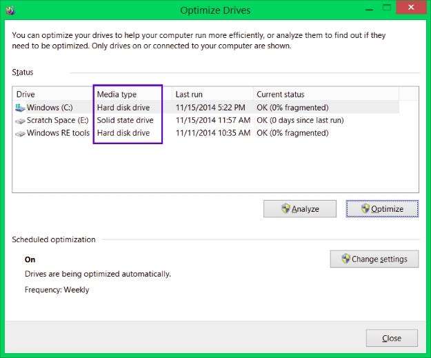 Kısa süre önce Windows 8 yüklü önceden birleştirilmiş bir bilgisayar aldım ve dahili sürücünün SSD veya HDD (SATA veya başka türlü) olup olmadığı hakkında hiçbir fikrim yok. Sürücünün SSD olup olmadığını anlamanın bir yolunu bulamadım (sürücünün kapasitesi / boyutu dışında). Ancak artık SSD'lerin boyutları HDD'lerin boyutlarına yaklaştığına göre, bu yöntem bilgisayarımın hangi tür sürücüye sahip olduğunu belirlemek için iyi bir yaklaşım olarak hizmet etmiyor. Bir SSD sürücüsünü algılamak için başka yöntemler var mı?