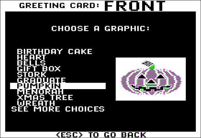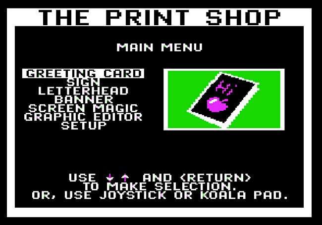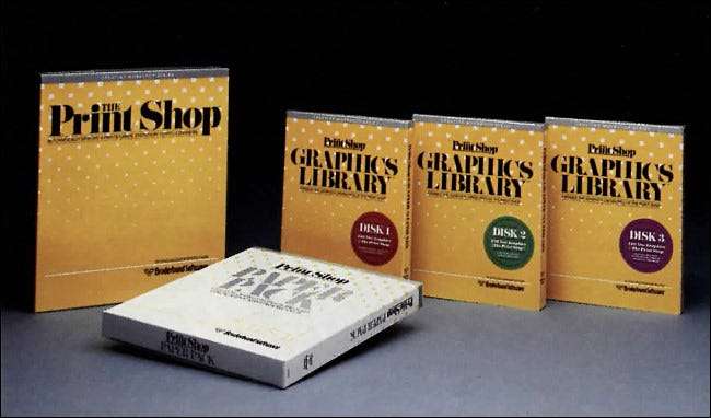 Sadece bir yıl sonra, Brøderbund'un baskı dükkanı sayesinde bu görevi sizin için yapacak bir bilgisayar ve masaüstü yazıcınızı kullanabilirsiniz. Menü odaklı arabirimini kullanarak, grafik tasarım deneyimi olmayan kişiler, tebrik kartlarını, afişleri ve antetli kağıtları kullanabilir. nokta matris yazıcıları O zamanlar yaygındı.