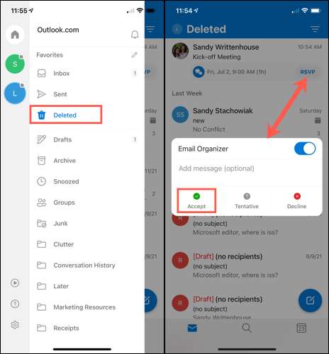 Mobil cihazınızdaki Outlook uygulamasında, silinen klasördeki daveti gördüğünüzde "RSVP" üzerine dokunun. Daha sonra "Kabul Et" de dokunabilir ve yoluna gönderebilirsiniz. Bu, Android, iPhone ve iPad'deki Outlook'ta aynı şekilde çalışır.