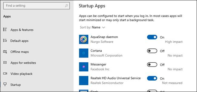 Oturum açtığınızda baştan başlayarak uygulamaları durdurmak için, muhtemelen Windows 10's Ayarlar uygulamasında Başlangıç Uygulamaları ekranını kullanın . Bu, başlangıçta çalışmak isteyen uygulamaları açıp kapatabileceğiniz yerdir. İyi çalışır ve başlangıç klasörlerinde görünmeyecek bazı uygulamaları gösterir, ancak bunlara hala erişebilirsiniz.