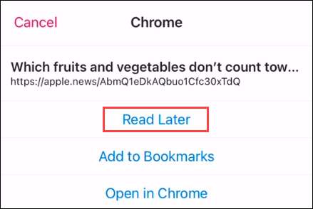 “Daha sonra oku.” Chrome menüsü dokunun itibaren