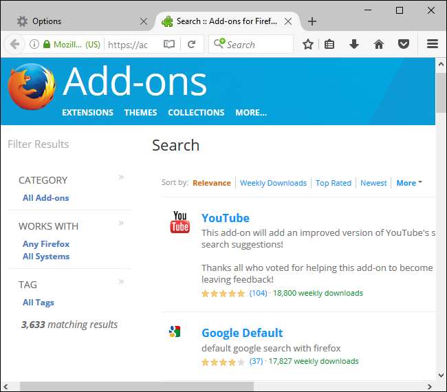 Firefox sizi şuraya götürecek Mozilla Arama Eklentileri sitesi , tercih ettiğiniz arama motorlarına göz atabileceğiniz ve kurabileceğiniz yer. Galeride mevcutsa, istediğiniz arama motorunu arayın ve yükleyin,