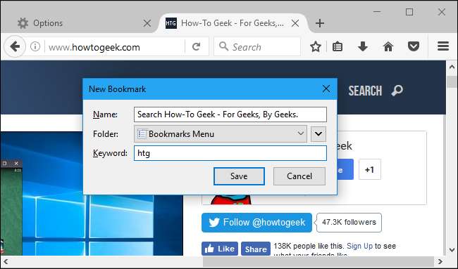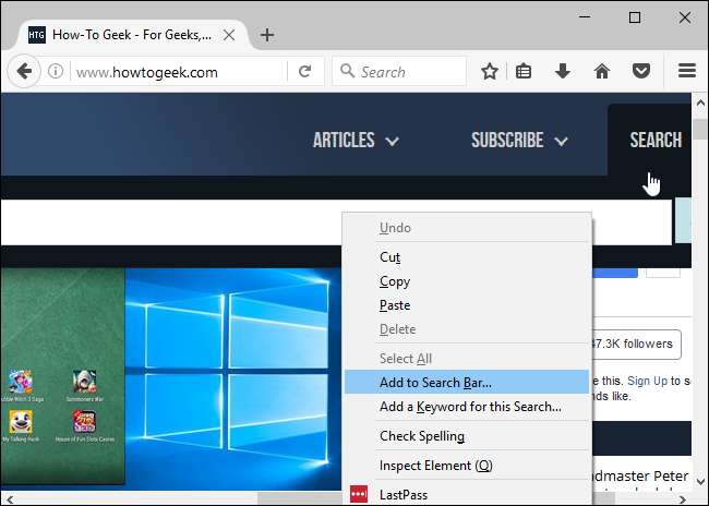 Herhangi bir web sayfasındaki bir arama kutusu için o arama kutusunu sağ tıklayıp "Bu Arama için Anahtar Kelime Ekle" yi seçerek hızlı anahtar kelimeler oluşturabilirsiniz. Örneğin, bunu Nasıl Yapılır Geek’in web sitesindeki arama kutusuyla yapabilirsiniz.