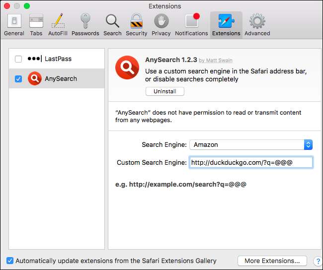 Uzantıyı yükledikten sonra Safari> Tercihler> Uzantılar> AnySearch'e gidin. Listeden tercih ettiğiniz arama motorunu seçin veya adresi özel bir arama motoruna verin. Burada seçtiğiniz arama motoru, Safari adres çubuğundan her arama yaptığınızda kullanılacaktır.
