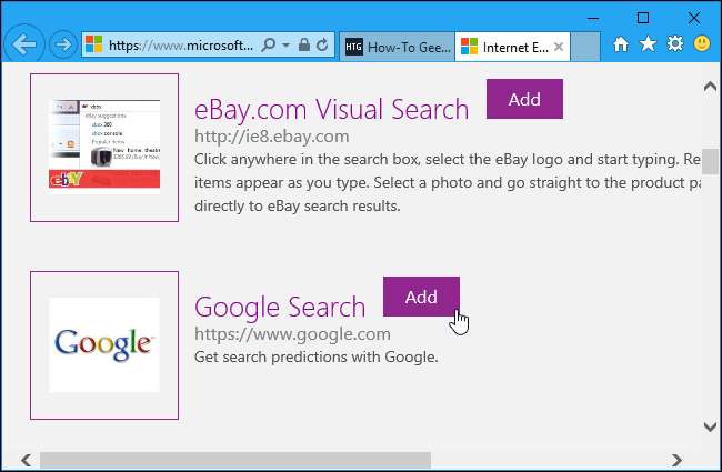 Götürüleceksiniz Internet Explorer Galeri sayfası . Eklemek istediğiniz arama motoru galeride mevcutsa, bulun ve Internet Explorer'a eklemek için "Ekle" düğmesine tıklayın.