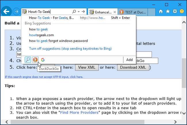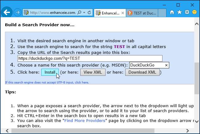 Özel arama sağlayıcınızı oluşturmak ve eklemek için sayfadaki talimatları izleyin. Arama motorunuzu ziyaret etmeniz, "TEST" kelimesini aramanız, arama sonuçları sayfasının adresini adres çubuğundan kopyalamanız ve sayfadaki kutuya yapıştırmanız gerekir.