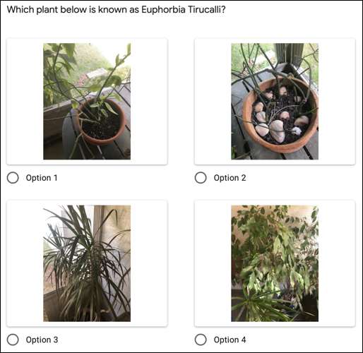 Üzerine bir soruya dayanarak Google Forms'ta bir resim , Görüntüleri çoktan seçmeli ve onay kutusu soruları için cevap seçenekleri olarak kullanabilirsiniz.
