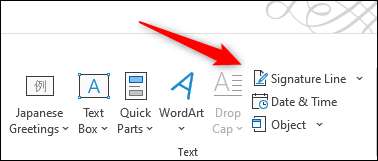 Öncelikle, devam edin ve imza hattını eklemek istediğiniz Word belgesini veya Excel elektronik tablosunu açın ve ardından imleci eklemek istediğiniz yere yerleştirin. Sonra, "Ekle" sekmesinin "Metin" grubunda bulunan "İmza Hattı" nı tıklayın.