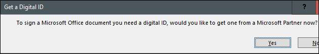 Zaten bir dijital imzanız yoksa, imza hattını çift tıklattığınızda, belgeye yönelecek bir kişiye ihtiyacınız olacağını söyleyen bir ofisten bir istemi alırsınız. Ofis, istemdeki bir Microsoft ortağından birini almak isteyip istemediğinizi soracaktır.