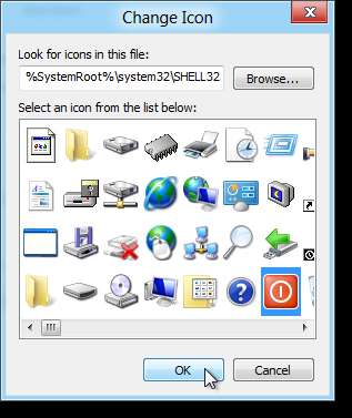 Varsayılan olarak, shell32.dll dosyasındaki simgeler görüntülenir. Gözat düğmesini başka bir .exe, .dll veya .ico dosyası seçmek için kullanabilirsiniz, ancak shell32.exe dosyasında pek çok simge bulunur. Bir güç sembolü simgesi seçtik. Simgenizi seçtikten sonra Tamam'ı tıklayın.