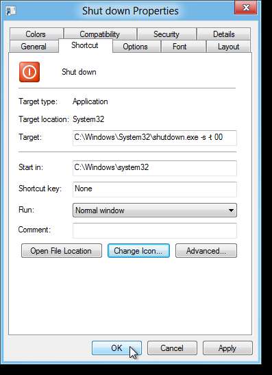 Özellikler iletişim kutusundaki Kısayol sekmesi görüntülenir. Simgeyi Değiştir'i tıklayın.