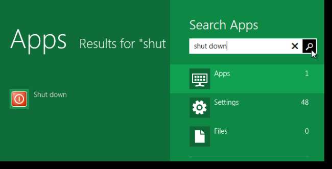 Arama paneli ekranın sağ tarafında görüntülenir. Aşağı kaydırın ve listeden Uygulamalar'ı seçin. Uygulama Ara düzenleme kutusuna "kapat" (veya kısayolunuzu verdiğiniz adı) girin. Enter tuşuna basın veya büyüteci tıklayın.