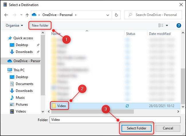 Videolarınızın saklanması için mevcut bir klasörü seçin veya yeni bir klasör oluşturmak için "Yeni Klasör" düğmesine tıklayın. Bir klasör seçtikten sonra, onu seçin ve "Klasör'i seçin."